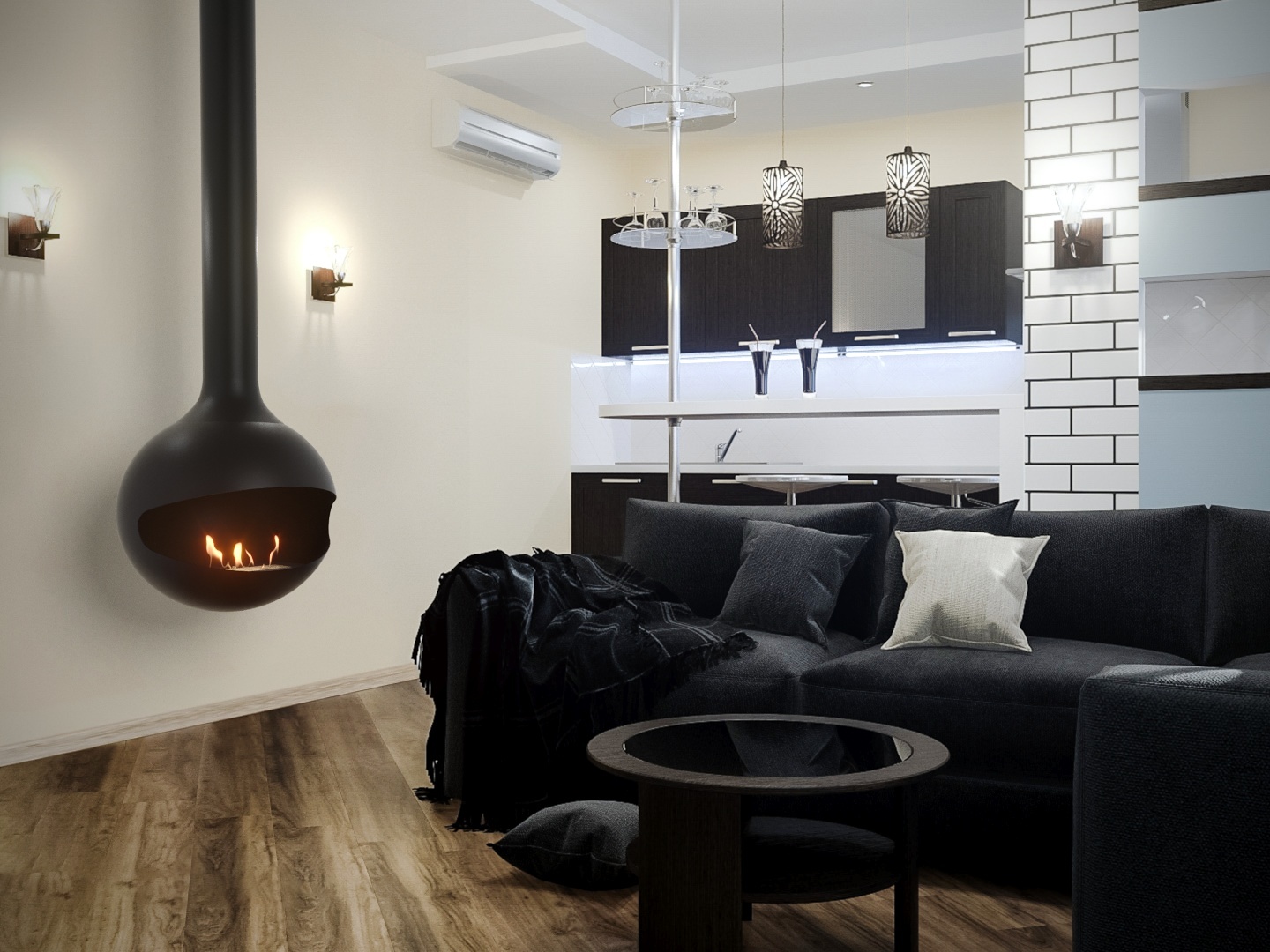 Дело в том, что необычный формат здесь совмещается с преимуществами привычного камина традиционной конструкции. Парящий камин фиксируется к потолку или стене. Для его устройства и работы не требуется специального места, подготовки площадки на полу. Это оптимальное решение для современных небольших жилых помещений.